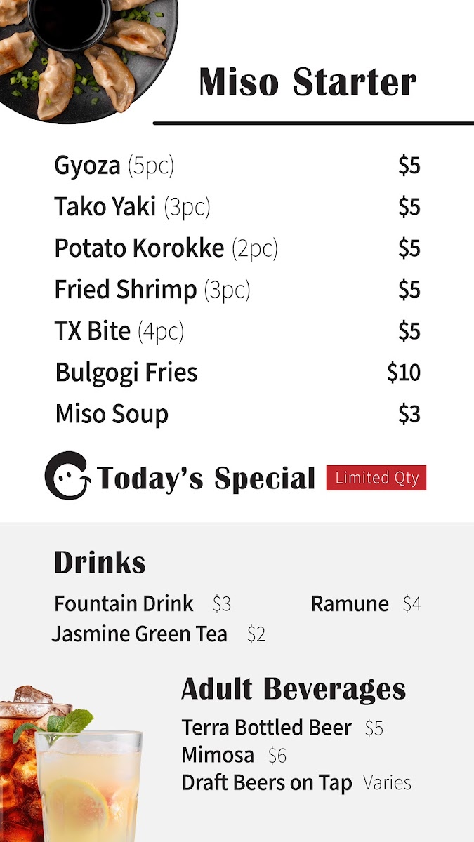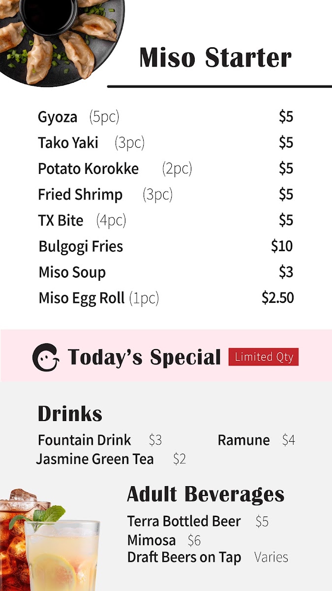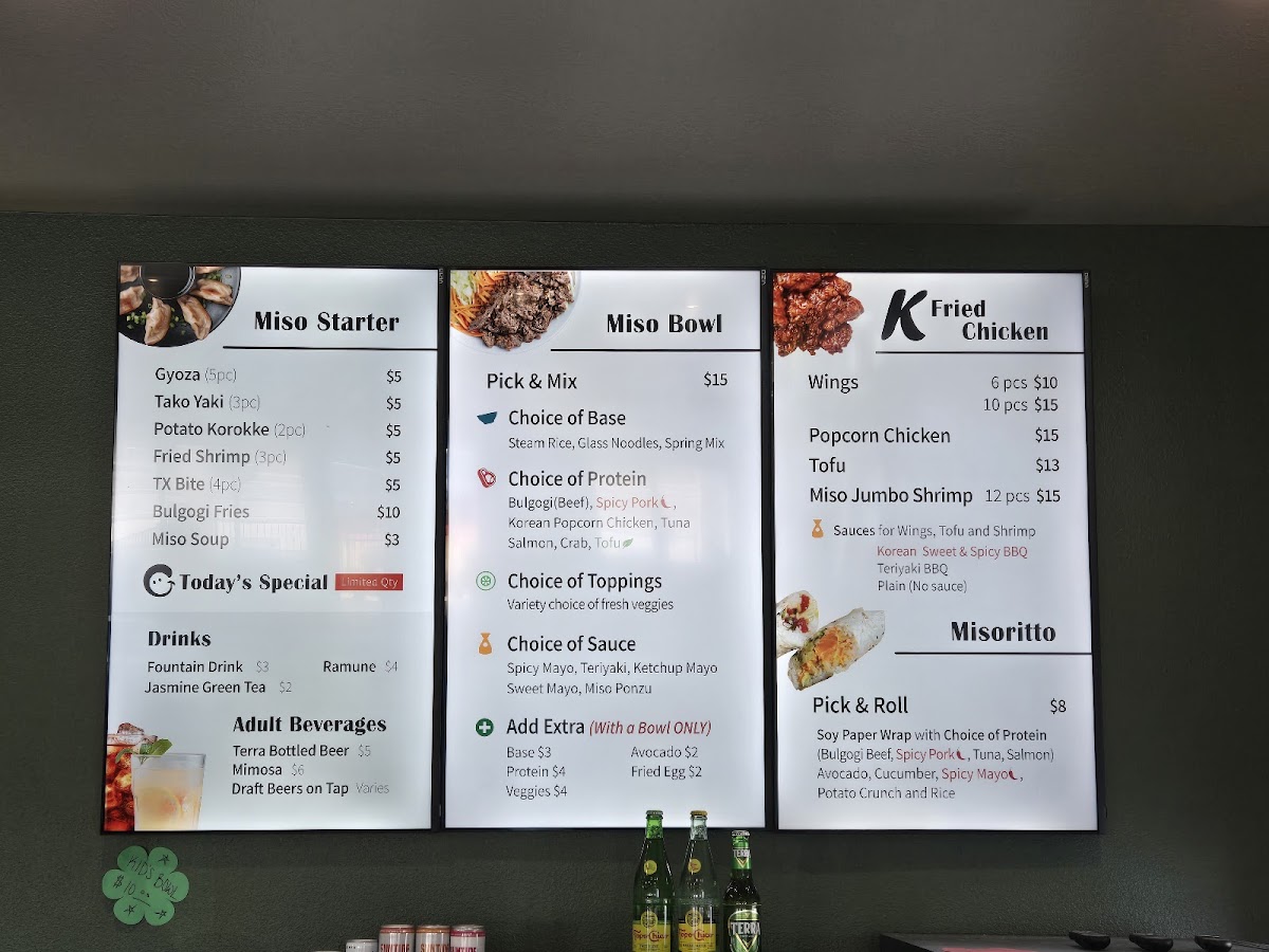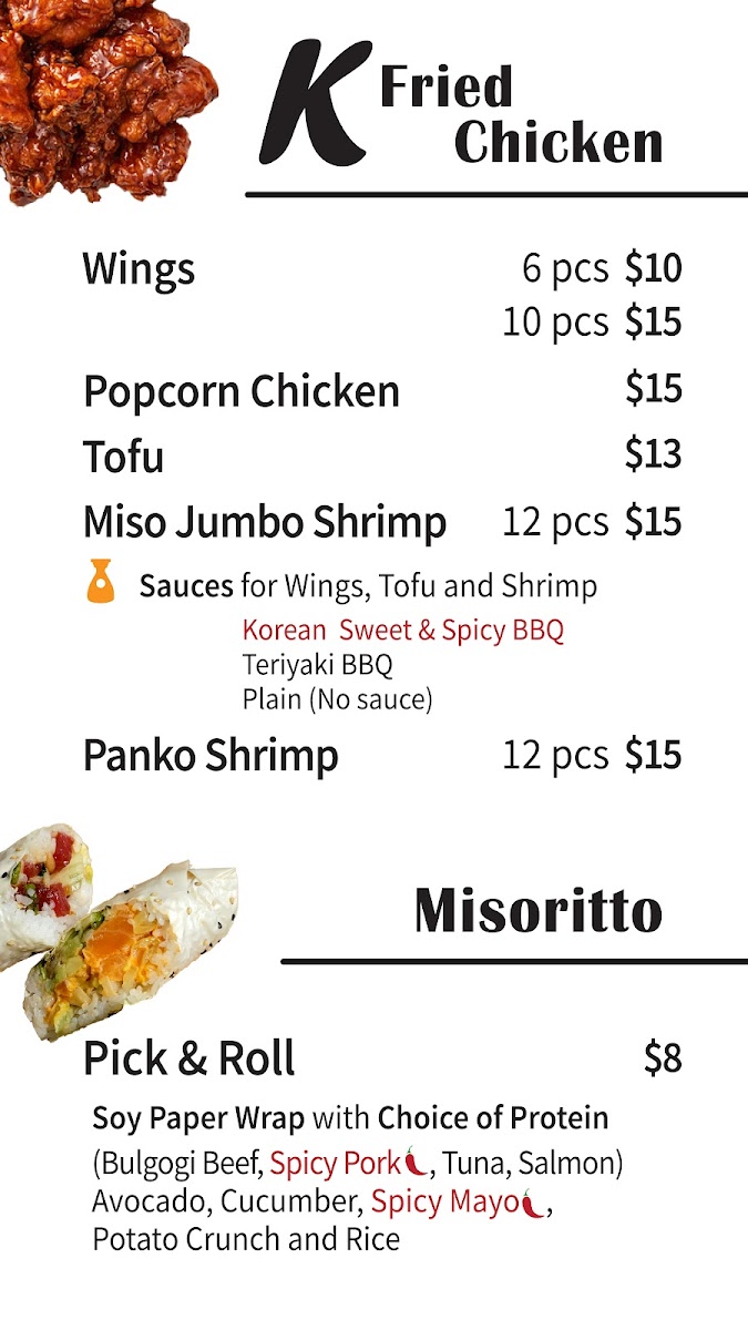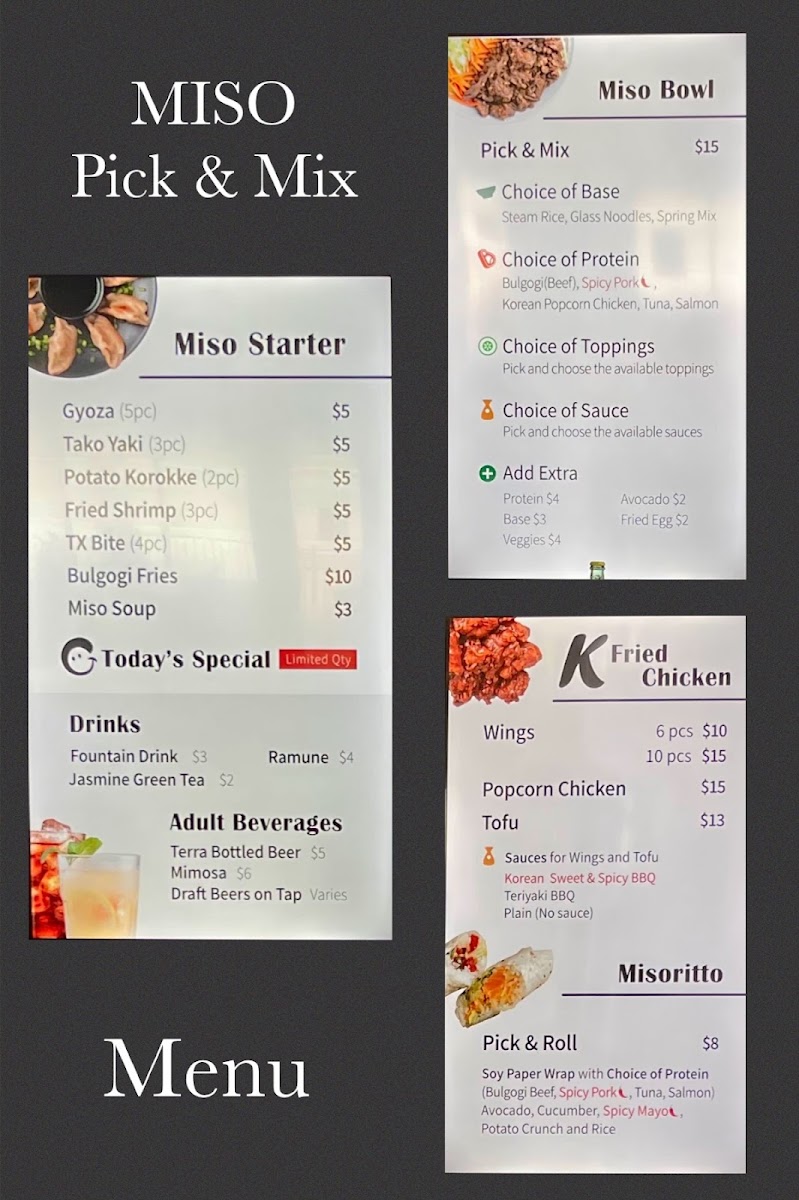 Introducing the menu at Miso Pick & Mix, a vibrant culinary gem located in Temple, TX, where bold flavors meet fresh ingredients. Offering an enticing selection of Korean-inspired dishes, this restaurant shines with its signature items like the Miso Chicken Wings and Popcorn Chicken, each bursting with flavor for just $16. For seafood lovers, the Miso Jumbo Shrimp can be enjoyed with a choice of Sweet & Spicy or Teriyaki sauce, also priced at $16.